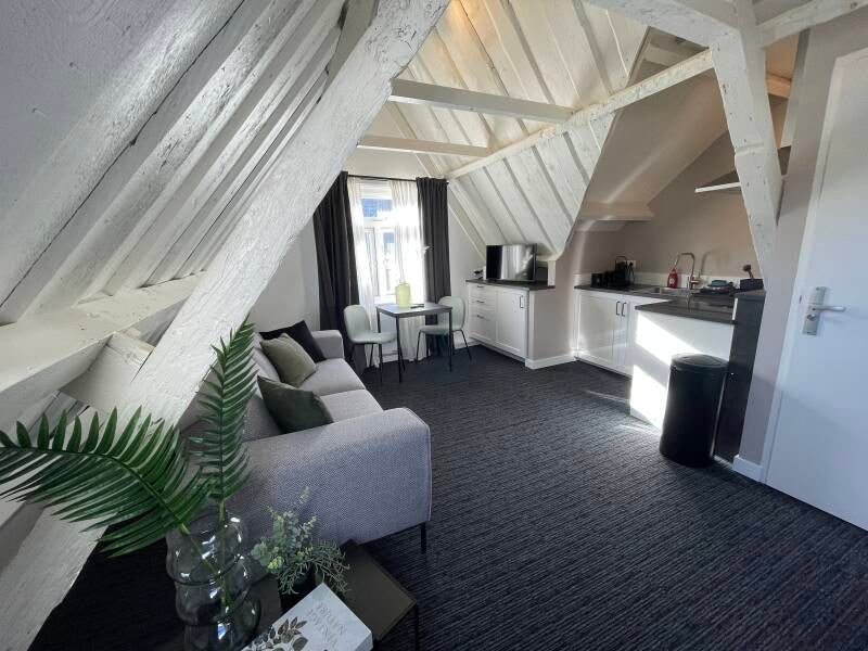 Het woongedeelte bevindt zich aan de voorzijde van het appartement. De woonkamer is voorzien van een bankstel en een televisie met kabelzenders. Het appartement beschikt over een 2-persoons boxspring bed.